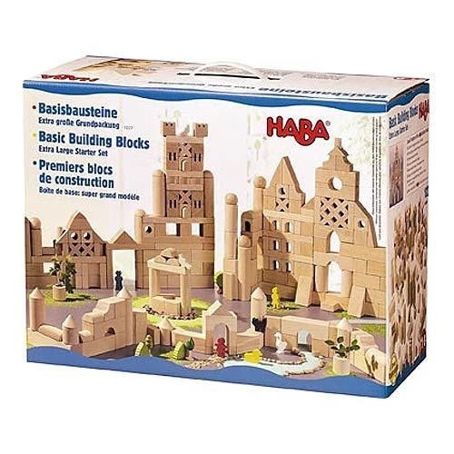 Die Haba Bausteine Extra große Grundpackung 1077 besteht aus 102 Teilen mit dem einheitlichem Grundmaß von 4 cm, die auch mit der Kugelbahn und anderen Haba Bausteinen verbaubar sind.