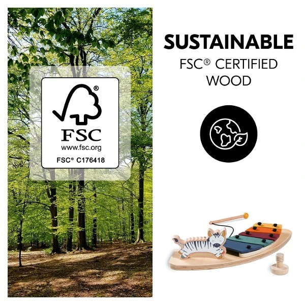 Das leicht abwischbare Spielbrett wird aus recyceltem, GRS-zertifiziertem Material gefertigt und das Spiel aus langlebigem Holz, welches aus FSC®-zertifizierten Wäldern stammt.