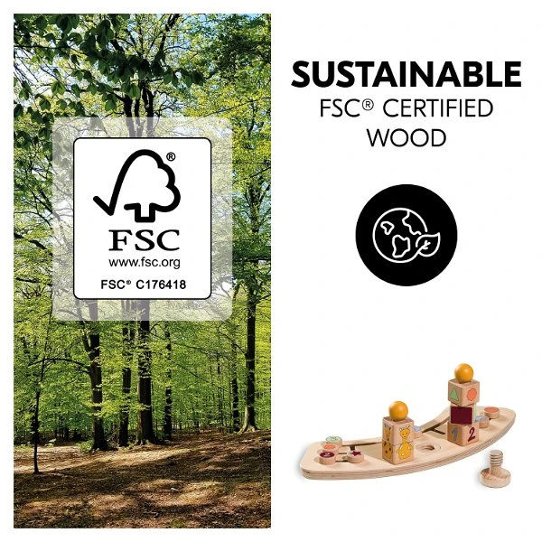Das Spiel besteht aus langlebigem Holz, das aus FSC®-zertifizierten Wäldern stammt. Dies garantiert eine nachhaltige und ökologische Waldnutzung, die Pflanzen und Tiere schützt.