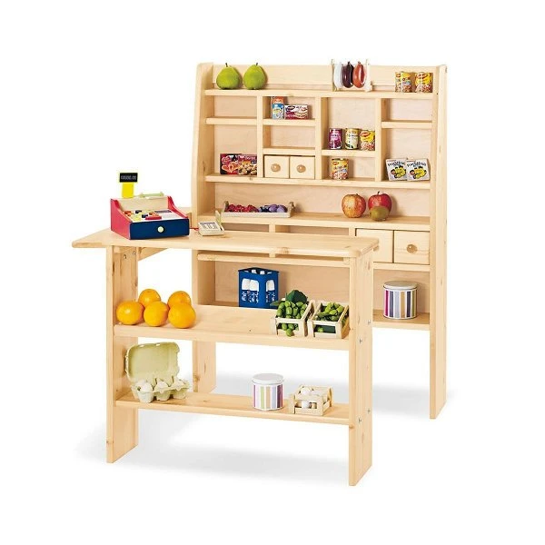 Der Pinolino Kaufladen Kimo wird in Fichte massiv, lackiert hergestellt. Die Rückwand ist in Buchensperrholz gefertigt. Im Lieferumfang sind zwei große und zwei kleine Schubladen enthalten. Hier findet der Kaufladenbesitzer seine Erfüllung. Ob Mädchen oder Junge, jedes Kind kann hier die Waren des täglichen Lebens kaufen und verkaufen.